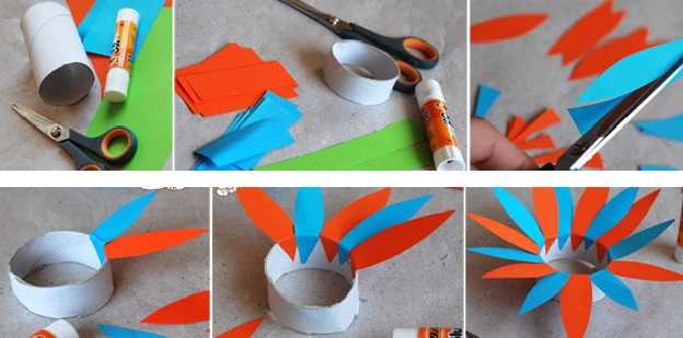 Порежьте рулончик на кольца. Вырежьте лепестки из цветной бумаги разного цвета. Приклейте их внутрь кольца.