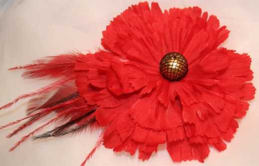 Для того, чтобы сделать такой зажим, нам необходимо искусственный цветок (в данном случае тканевая гвоздика), любая бусинка, маленький красный шарик, перо и зажим для волос.