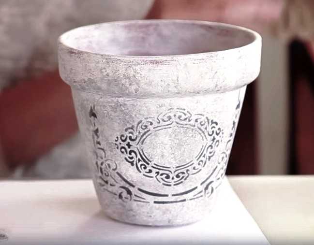 Возьмем трафарет (продаются в магазинах для творчества), они бывают на клеевой основе, с такими трафаретами легче работать, но можно и обычный трафарет, кому как удобнее, приклеиваем его. В серую краску добавляем немного черной и с помощью губки наносим краску на трафарет. Обязательно губку нужно отбить на листик бумаги, чтобы на ней было мало краски, она должна быть полусухая. Снимаем трафарет, по моему получилось очень красиво. В процессе работы наш горшок почти высох. С помощью наждачной бумаги мы добавим немного обшарпанности нашему горшку. В завершении процесса горшок можно покрыть акриловым лаком или атмосферостойким, если он будет стоять на улице.