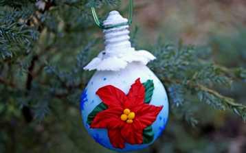 Следующим этапом будет декорирование. Для декора нам нужно размягчить зеленый и красный пластик. Чтобы пластик был очень мягкий, добавляем жидкий гель и руками размягчаем пластик до тягучей массы. Из зеленого пластика делаем 3 капельки, затем расплющит их пальцами и с помощью иголки придать жилистую структуру каждому лепесточку. С красными листиками проделываем тоже самое. Красных листиков должно быть 6, зеленых 3. Затем на поверхность шарика, с помощью иголки мы выкладываем первый ряд из зеленых листочков, второй ряд из красных листочков, в количестве 3 штук и третий ряд у нас тоже будет состоять из 3 листочков красного цвета, но уже меньшего размера. В серединке цветка мы делаем углубление, из полимерной глины желтого цвета катаем маленькие шарики, капаем капельку жидкой пластики в середину цветка и укладываем желтые шарики. С обратной стороны делаем точно такой же цветок. Затем берем полимерную глину синего цвета, разбавляем жидким гелем и с помощью иголочки рисуем различные снежинки, точечки. Рисунок готов. Ставим наш шарик на силиконовую подставку и обжигаем в духовке (температура обозначена на пакетике с глиной). После обжига закрашиваем цоколь белой акриловой краской, даем краске подсохнуть, привязываем веревочку, вот и все наша игрушка готова.