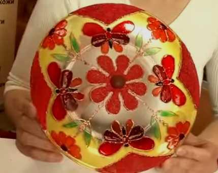 Работа с контуром. Все что мы нарисовали заранее и сделали объемным обводим бронзовым контуром. Теперь дорисовываем стебельки нашим цветочкам и композиция почти готова. Дорисовав стебельки нам не хватает листочков. Листочки мы будим закрашивать с обратной стороны зелеными красками по керамике, но перед этим нужно сделать контур. Нарисовав контуром листочки и стебельки, нужно подождать, чтобы они высохли, это также можно сделать при помощи фена. По окончанию нашей работы края тарелочки нужно закрасить желтой перламутровой краской. Надеваем перчатки и легкими, отрывистыми движениями наносим краску по краям тарелки. В центр добавляем декоративный стеклянный камушек, который называется кабошон. Приклеивать его мы будем на витражную краску.