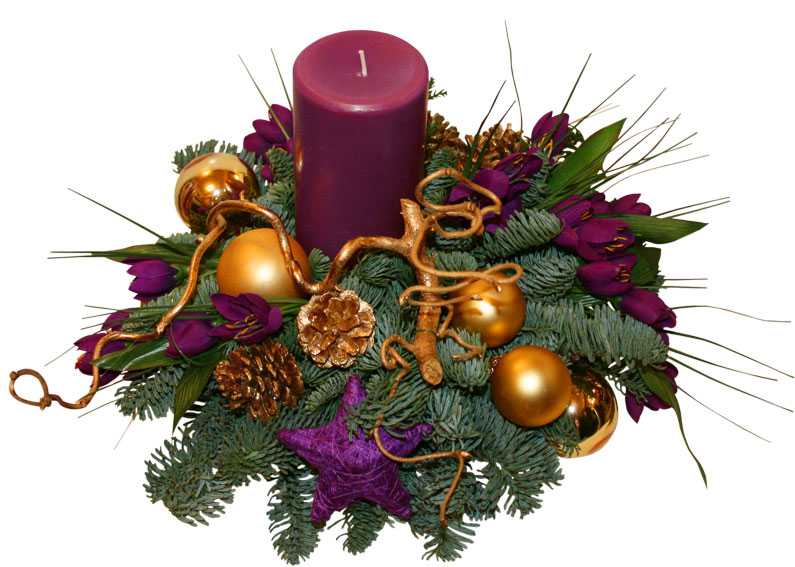 Приступаем к формированию композиции. Сначала нужно оазис уложить в кашпо, заполняя пустое место между оазисом м кашпо плёнкой. Делаем это с той целью, чтобы поливая композицию, вода не проходила через стенки кашпо. После этого, берём свечу, снизу втыкаем проволоку и только тогда вставляем свечу в оазис. Проверяем, хорошо ли зафиксирована свеча. Секатором нарезаем еловые веточки на сегменты необходимой нам длины. У подготовленных веточек нужно очистить нижний конец от иголок и аккуратными движениями вставить их вокруг свечи, создавая форму будущей композиции. Создаваемая композиция будет разной по форме, цветовому решению и наполнению, тут появляется пространство для вашего воображения. Главное, чтобы она получилась праздничной и выдержанной в правильной цветовой гамме. Все цвета, использованные при составлении композиции, должны сочетаться между собой. Вставляя ветки, смотрите, чтобы композиция была симметричной, ровной, без пустот. Если таковые имеются, то заполните их веточками.