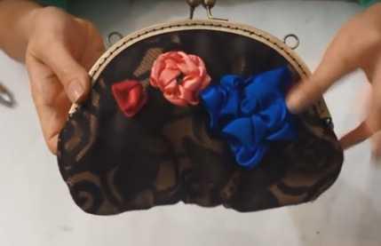 Фермуар нужно начинать пришивать с середины. После того, как мы прошили от середины до края фермуара, начинаем прошивать в обратную сторону, это делается для того, чтобы образовались двойные стежки и фермуар держался крепко. Далее таким же образом с середины и в обратную сторону прошиваем другую часть фермуара. Затем посередине закрепляем нитку узелком. У нас все стежки получились аккуратные и ровные, внутри сумочки все стежки ушли под фермуар. Украсить такую сумочку можно чем угодно, стразами, камнями, кружевом, лентами. Мы украсили розочками, которые предварительно сделали из лент. У нас получилась замечательная сумочка-кошелек.