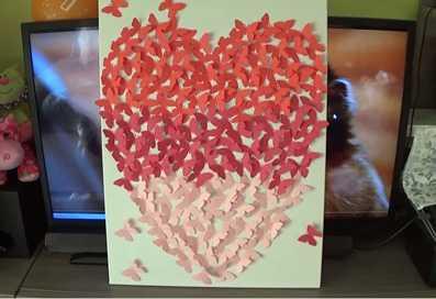 Бабочки на этой картине выглядят словно живые, а ведь они сделаны из цветной бумаги. Сразу хотим отметить, что эта работа кропотливая и требует много времени и усидчивости, но она того стоит. Такую картину можно подарить не только на день Святого Валентина, но и на другие праздники.