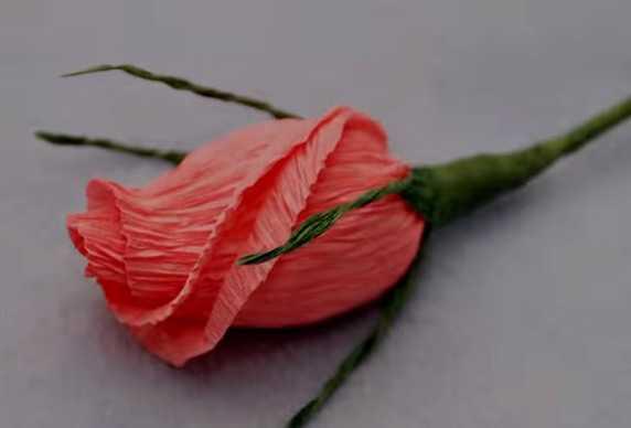 Из розовой бумаги вырезаем два одинаковых квадратика. Размер квадратика зависит от размера вашей конфеты, в нашем случае размер квадрата 6х7 см. Складываем два квадратика вместе и вырезаем два лепестка одновременно. Два вырезанных лепестка складываем также вместе, но один из лепестков опускаем на 1-2 мм ниже. Так как гофрированная бумага тянется, мы лепестки аккуратно, не спеша растягиваем пальцами. Лепестки должны получится выпуклыми, похожими на настоящие. Затем в середину этих лепестков кладем конфету и формируем бутон. После того, как мы сформировали бутон, фиксируем его ниткой. Завязывать нитку нужно так, чтобы остался хвостик. Затем предаем форму бутону, отгибая кончики лепестка в обратную сторону. Кончики лепестка немного обрезаем, придавая ему более естественную форму. Наш бутончик готов. Вставляем в бутон шпажку и переходим к изготовлению чашелистика.