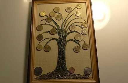 Панно из монет под названием «Денежное дерево», очень оригинальная и в тоже время модная вещь из мира «хенд-мейд». Такая картина может стать не только интерьером или украшением в вашем доме, но еще ее можно применить в качестве подарка, который может оказаться беспроигрышным вариантом.