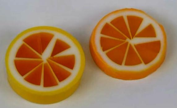 После того, как мыло полностью застыло, достаем его из стаканчика и полностью срезаем нижний, прозрачный слой. Наше мыло почти готово, осталось лишь сделать кожуру, чтобы все выглядело правдоподобно.