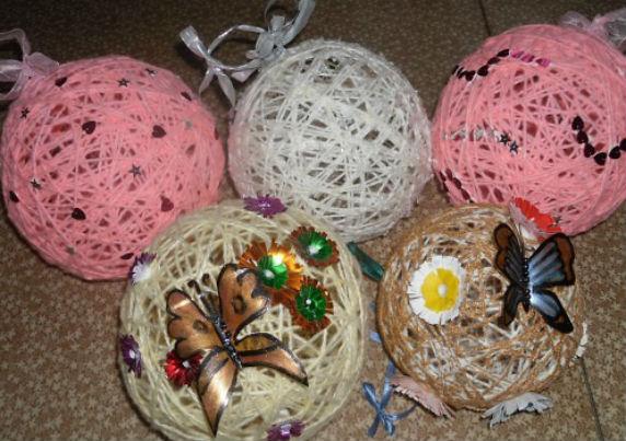 Плотность шарика можно делать какую угодно, это решать вам. По окончнию наматывания, нитку снова фиксируем. И затем отправляем будущую игрушку сушиться. Сушить шарик нужно в подвешенном виде, чтобы клей просыхал равномерно. Ту же операцию, проделываем и с другими шариками. После того, как шарики полностью просохли, можно приступать к их декорированию, но перед этим, нужно избавиться от основной заготовки. Далее с помощью острого предмета, прокалываем шарик и аккуратно достаем его из ниточного каркаса. Освобождая шарик, ненужные нитки можно обрезать, от этого конструкция уже ни каким образом не пострадает.