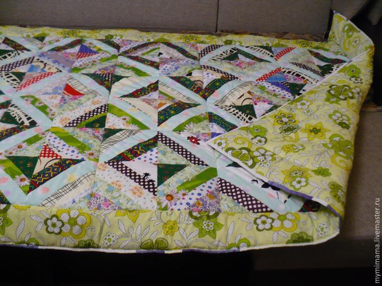 Раскладываем нижнее полотнище, выкроенное по размеру верхнего (или чуть больше), дальше синтепон и верхнее полотнище, скалываю булавками и простегиваю лоскутную часть одеяла, сначала поперек, а потом вдоль.