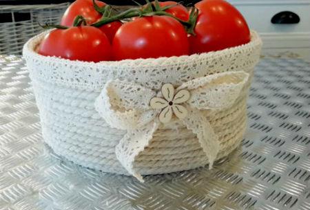 Такая вещица удобна в быту, в ней можно хранить косметику, бижутерию, а также фрукты и овощи. Вот так просто, с помощью обычной веревки можно создать корзинку любой формы и любого размера.