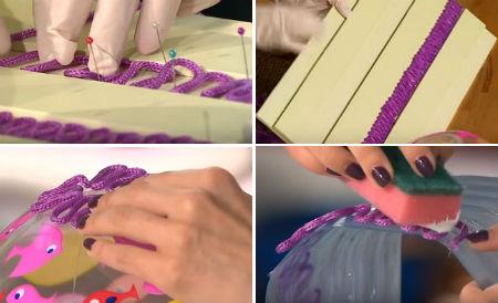Если вы задумали сделать абажур круглой формы, тогда для основы подойдет обычный надувной мячик. Если же абажур будет в форме цилиндра, основой может стать пластиковое ведерко или 5-литровая бутылка из-под воды. Чтобы выложить волну из веревки, мы будем использовать специальное приспособление, это бордюрчик из пенокартона. Также для этих целей подойдет обычный гафрокартон. Хорошенько пропитываем веревку клеем (как можно гуще) и постепенно выкладываем ее вдоль бордюрчика. Чем больше веревка будет пропитана клеем, тем лучше будет создаваться форма узора. Для удобства в работе и для более качественного узора, мы будем использовать обычные швейные булавки.