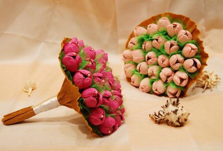 Букеты всегда приятно получать на любой праздник, особенно, если речь идет о собственноручно сделанном подарке, да еще и со сладким сюрпризом внутри. Плюс в том, что из гофрированной бумаги можно сделать любые цветы, какие только душа пожелает, и цвет можно подобрать индивидуально. В итоге получится полноценный подарок, который надолго останется в памяти виновника торжества.