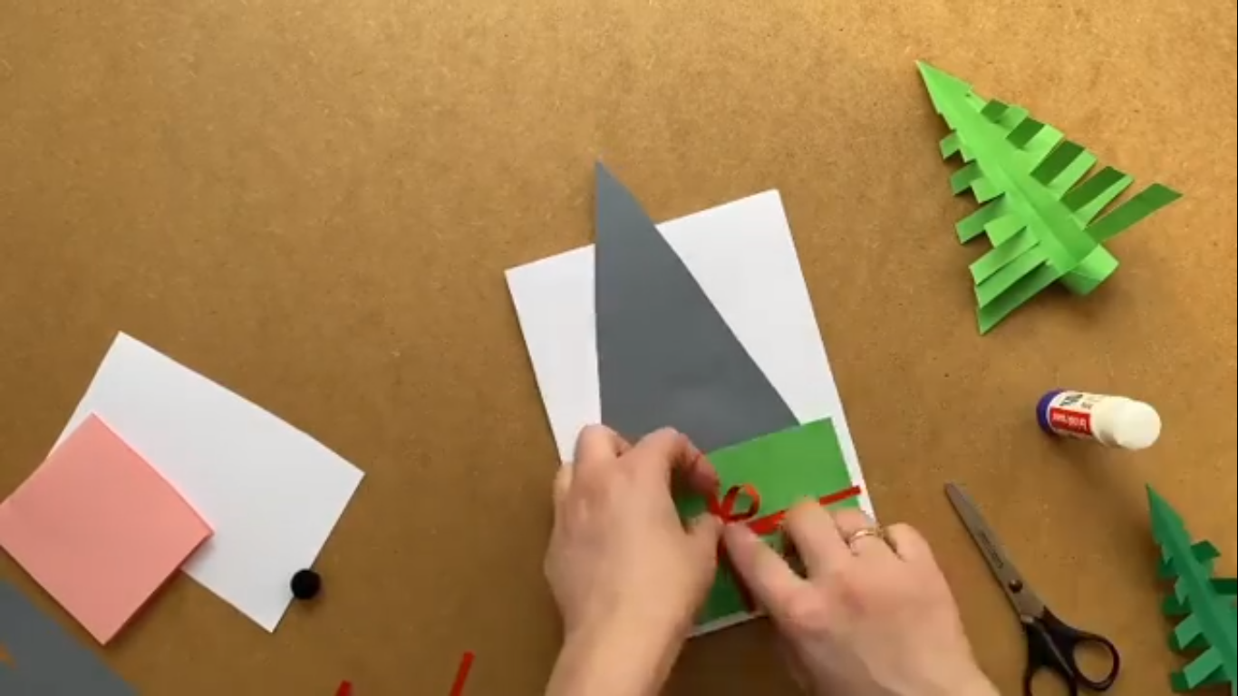 Итак, проще всего сделать объемную открытку из картона и гофрированной бумаги. В качестве основы подойдет плотная двухсторонняя бумага лучше всего красного цвета. Из зеленой гофрированной бумаги надо будет вырезать пять полос шириной по 2 см, которые после превратятся в красивую объемную елочку.