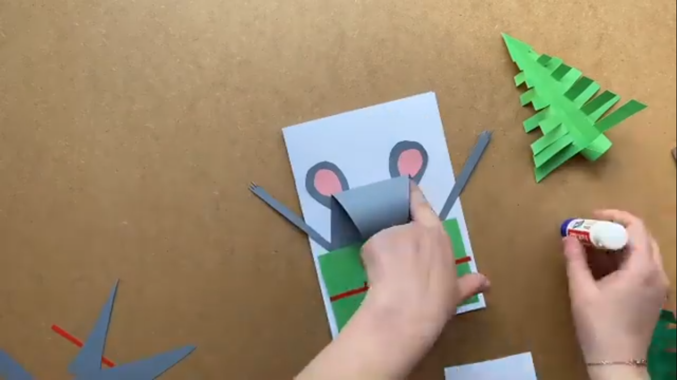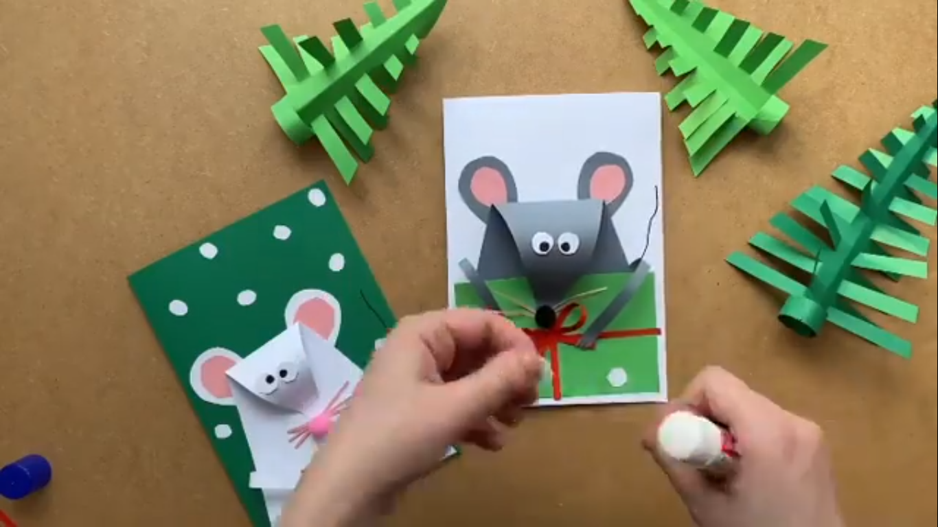 После этого острый конец треугольника, который был не приклеенным, заворачивается и фиксируется на прямоугольнике. Пора открыть секрет открытки. Треугольник это мышка, которая держит в руках подарок. Ей нужно будет приклеить еще лапки, хвост, ушки и глазки. А на подарок наклеить подарочную ленту из розовой бумаги. В итоге, должна получится объемная мышка, как на фото. Такая открытка очень оригинальная и приятно удивит как ребенка, так и взрослого.