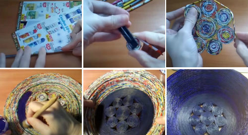 Даем хорошенько обсохнуть, и начинаем обматывать заготовку трубочками. Вначале закрепляем клеем, соединяем между собой так же, как написано выше. Диаметр нашего изделия нужно довести до 25 см, можно и больше. Во время наматывания трубочек клеем смазывайте бока только в некоторых метах, часто этого делать нельзя, мы еще будем придавать форму нашему кашпо.