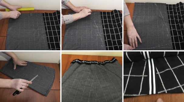 Ткань альпака очень напоминает трикотаж, но она плотнее и теплее, изнанка очень мягкая и приятная на ощупь, поэтому подкладка не потребуется. Сложим ткань пополам: учитывая, что ткань с правильными прямоугольниками, это позволяет сложить ее так, что белые полоски совпадают. Так как мы будем шить юбку-трапецию, то швы по бокам должны не совпадать по рисунку. Для этого мы применим трикотажную ленту – это также красиво подчеркнет линию бедер.