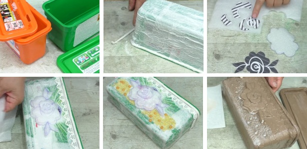 Приступаем к декорированию изделия. Бумажные полотенца рвем на небольшие кусочки и с помощью клея ПВА (немного разбавленного водой) наносим на всю поверхность контейнера. И так до самого конца, пока емкость снаружи не будет полностью покрыта бумажным слоем. Далее бумажные квадраты сворачиваем в тонкую трубочку, они послужат окантовкой. Бумажную окантовку закрепляем на бортиках емкости, хорошенько промазывая клеем. Даем немного подсохнуть.