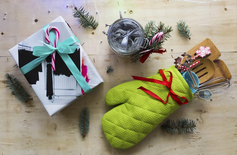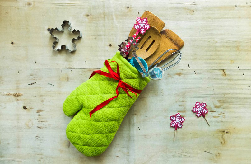 Если подарок – это набор разных элементов, например, кухонных принадлежностей или косметики, можно упаковать его в коробку или сумочку, но также можно использовать сам подарок как упаковку (например, кухонные принадлежности), упаковка будет представлять собой рукавицу, то есть элемент подарка. Все, что нужно – это красивая композиция, перевязанная лентой, и подарок готов.