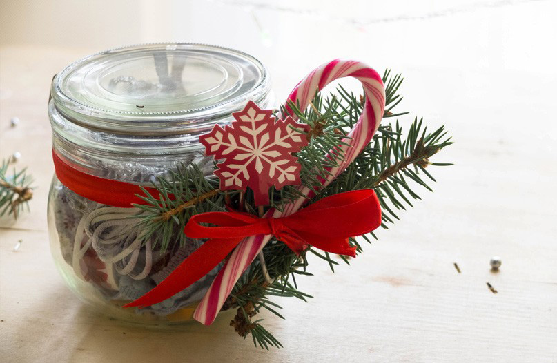 Обычная банка также может быть отличной упаковкой для подарка. Чтобы упаковка была более изысканной, вам понадобится только лента или шнурок и несколько рождественских аксессуаров.