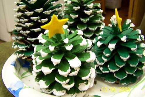 Еще из каждой шишечки можно сделать елочки и дарить своим гостям, как новогодний сувенир. Поставьте шишку на газету или полиэтилен и раскрасьте ее как на фото. Когда шишки подсохнут, то на кончики «веточек» нанесите белую краску — она будетимитировать снег, а из пластилина сделайте звездочки для украшения верхушки вашей «елочки».