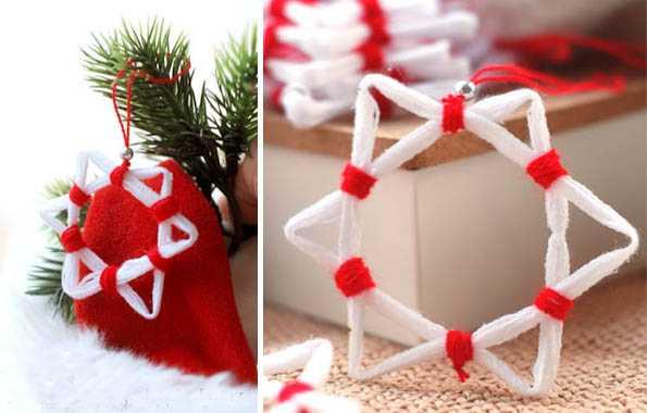Затем хорошо покрыть звезду немного разбавленным клеем ПВА. После высыхания красной пряжей закрепить пересечения.