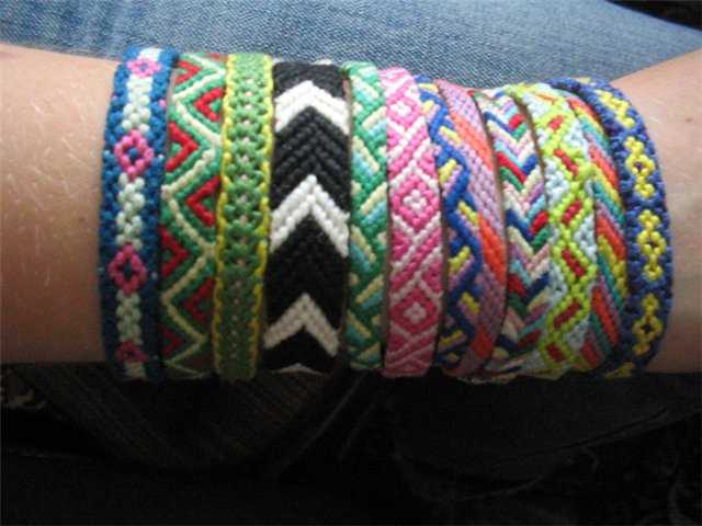 Закрепите браслет булавкой, чтобы он не перекручивался. Нитки разложите в том порядке, в котором будут располагаться цвета в готовом браслете. Нитью, которая находится в конце справа, завязываем узелки на ближайшей нитке, которая расположена слева. И идем последовательно. Та же нить связывает узелок на следующей и т.д. После первого плетения образуется первая строчка. Выглядеть этот ряд будет как полоска из узелков, расположенных по диагонали. Начинаем плести следующий ряд. Начинаем с той же нити. Последовательность плетения такая же, как и в первом ряду. Плести фенечку следует ряд за рядом, пока не получите необходимую длину. Готовый браслет снимаем с булавки, а кончики заплетаем в косичку. Этот вариант является самым простым. Если сплести нити в противоположную сторону, то получится совершенно другой узор. Также можно плести узор до середины обычным способом, а затем зеркальным. Способов плетения таких феничек существует огромное количество, все зависит только от вашей фантазии, усидчивости и терпения.