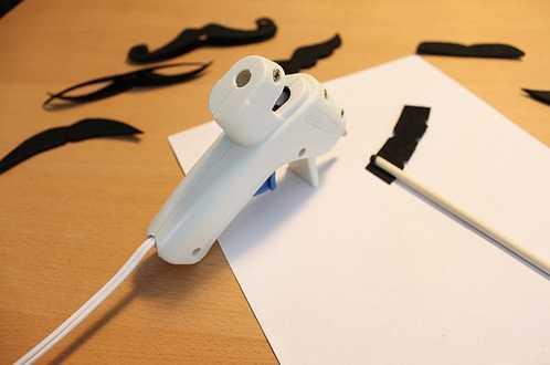 5. Используйте клеевой пистолет, что бы приклеить к окрашенной стороне усы. Желательно приклеить палочку под углом, что бы та не закрывала лицо.
