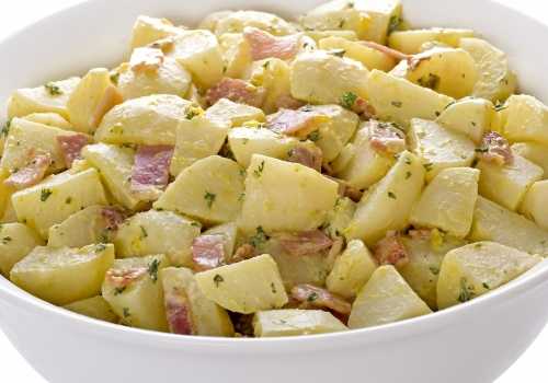 Ингредиенты: яйца - 4 шт., бекон - 4 ломтика, картофель - 750 г, соленые огурцы - 2 шт., петрушка - 2 ст. л. нарезанной, майонез - 160 мл, сметана - 1/3 стакана, лимонный сок - 2 ч. л.