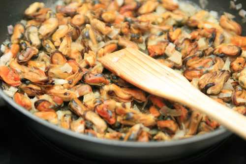 Мидии ошпарить кипятком, чтобы было легко очищать от скорлупы, хорошо промыть и поставить варить на несколько минут в подсоленной воде с лавровым листом.