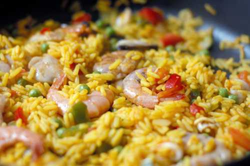 Продукты: рис - 250 г, масло - 2 ст.л., чеснок - 2 зубчика, острый перец - 1 красный, без семян, яйца - 2 шт., горошек - 200 г замороженного, лук - 1 пучок нарезанного зеленого, креветки - 290 г вареных, соевый соус - 1 ст.л.
