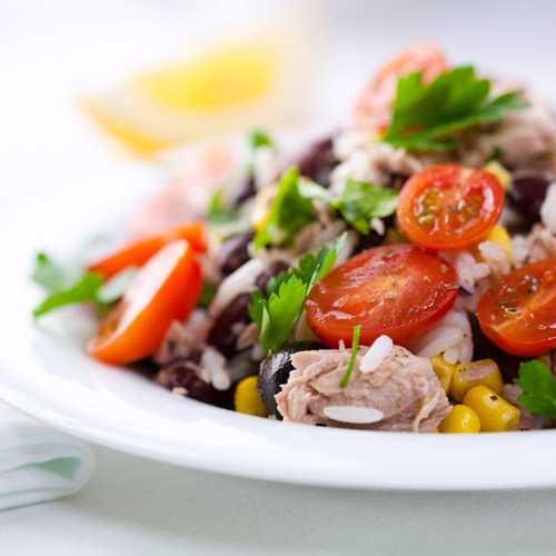 Ингредиенты: рис - 1/2 стакана длиннозернистого, помидоры - 4-5 помидоров черри, тунец консервированный - 1 банка, кукуруза - 2-3 ст. л., петрушка - 4 веточки, оливки - 2 горсти темных, без косточек, оливковое масло - 4 ст. л., уксус - 2 ст. л., горчица - 1 ч. л., соль, черный перец.