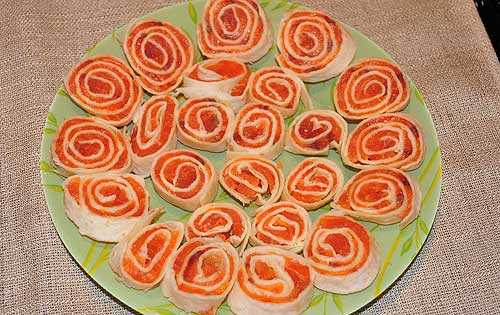 Редакция "Час Пик" Ингредиенты: соленая красная рыба (филе), готовый армянский лаваш. На поверхности лаваша разложите филе красной рыбы, порезанное на тонкие пластинки, сверните лаваш рулетом. Затем разрежьте острым ножом на кружочки.<