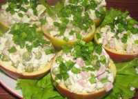 Выложить приготовленную начинку в яблочные чашечки, посыпать зеленым луком.