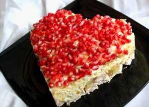 Слоеный салат в форме сердца, украшенный гранатом, идеально подойдет к праздничному меню на День святого Валентина.