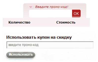 Доступ к желанныи бонусам и скидкам предоставляет уникальный код – комбинация цифр и/или букв. Для активации промо-кода необходимо, во время формирования своего заказа в интернет-магазине, ввести код в специальное поле, расположенное под итоговой суммой заказа. Там вы увидите следующий текст: "Введите промо-код" или "Введите код купона (акции)".