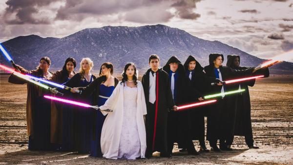 Жених и невеста – чаще всего два человека, обладающие похожими вкусами. Поэтому неудивительно, если оба они окажутся ярыми поклонниками всемирно известной саги о джедаях. Сейчас она набирает всё большую популярность, по всему миру пополняются фанатские клубы и организации. И почему бы не сыграть свадьбу в стиле такого необычного фильма?