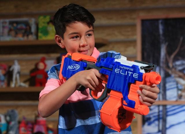 Компания Hasbro является производителем игрушечного оружия NERF. Эти игрушки теперь доступны во всем мире. В зависимости от моделей, среди которых представлен практически весь оружейный арсенал (пушки, автоматы, винтовки, пулеметы, пистолеты, бластеры, арбалеты, луки), оружие может стрелять полимерными стрелами, дисками или водой. Это полностью безопасные устройства, предназначенные для подвижных детских игр. Дальность выстрела зависит от модели и может составлять от 8 до 30 метров. Пистолеты также различаются по способу стрельбы: в ассортименте имеются модели, которые перед выстрелом нужно перезагружать, и полностью автоматические. Есть также бластеры, предназначенные для мальчиков и девочек различных возрастных категорий.