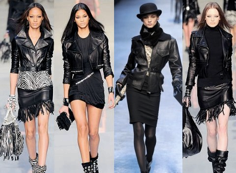 Кожаные куртки великолепно гармонируют и с юбками различных фасонов. Правда здесь следует учитывать то, что длинные куртки необходимо комбинировать с пышными юбками длины миди или макси, а короткие – с изделиями узких фасонов длины мини.