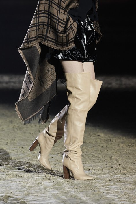 Высокие сапоги будут бесспорным хитом среди модной обуви в тенденциях осени-зимы 2021 года. Они придают обуви небрежный и рок-н-ролльный стиль. Сапоги с напуском могут быть на каблуке или на плоской подошве, как у мушкетеров. Они станут отличным дополнением осенне-зимних стилизаций с платьями, пончо и подходящими брюками, что дополнительно подчеркнет оригинальный, негабаритный дизайн этой обуви.