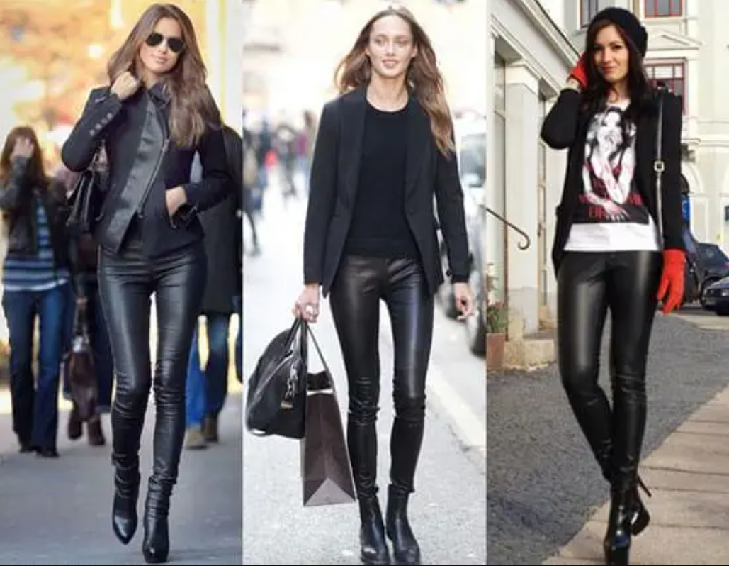 Сочетать кожаные леггинсы с футболкой и спортивной обувью можно в повседневном стиле. Вы можете создать образ для вечеринки, надев облегающее боди, туфли на высоком каблуке и кожаную косуху. Если вы хотите выглядеть элегантно и повседневно, сочетайте кожаные леггинсы с элегантными туфлями на высоком каблуке, рубашкой и курткой.