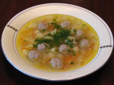 Из полученной массы сформировать фрикадельки, опустить их в кипящую воду и варить на слабом огне 10 минут. В это же время положить нарезанный кубиками картофель и пассерованные на сливочном масле морковь и лук. Варить до тех пор, пока «поплавки-фрикадельки» не всплывут. Готовый суп посолить по вкусу и добавить зелень.