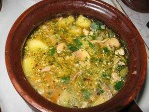 Способ приготовления. Сварите бульон. Половину указанного картофеля очистите, опустите в кипящий бульон и варите до готовности, выньте и разомните до состояния пюре. Лук и морковь нашинкуйте, обжарьте в растительном масле, добавьте промытые и нарезанные грибы и обжарьте их. Полученную массу сложите в горшочки, туда же нарежьте кубиками оставшийся картофель, залейте бульоном с разведенным в нем пюре, добавьте лавровый лист, черный перец горошком и поставьте в духовку. Полученную массу сложите в горшочки, туда же нарежьте кубиками оставшийся картофель, залейте бульоном с разведенным в нем пюре, добавьте лавровый лист, черный перец горошком и поставьте в духовку.