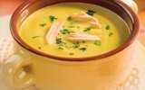 Взбить желток со сметаной, залить приготовленным супом, все хорошо перемешать до однородной массы, добавить нарезанные кусочками сыр (50 г), мелко нарубленную зелень петрушки и мелиссу.