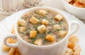 Готовый суп разлить по тарелкам, добавить сухарики, посыпать зеленью.