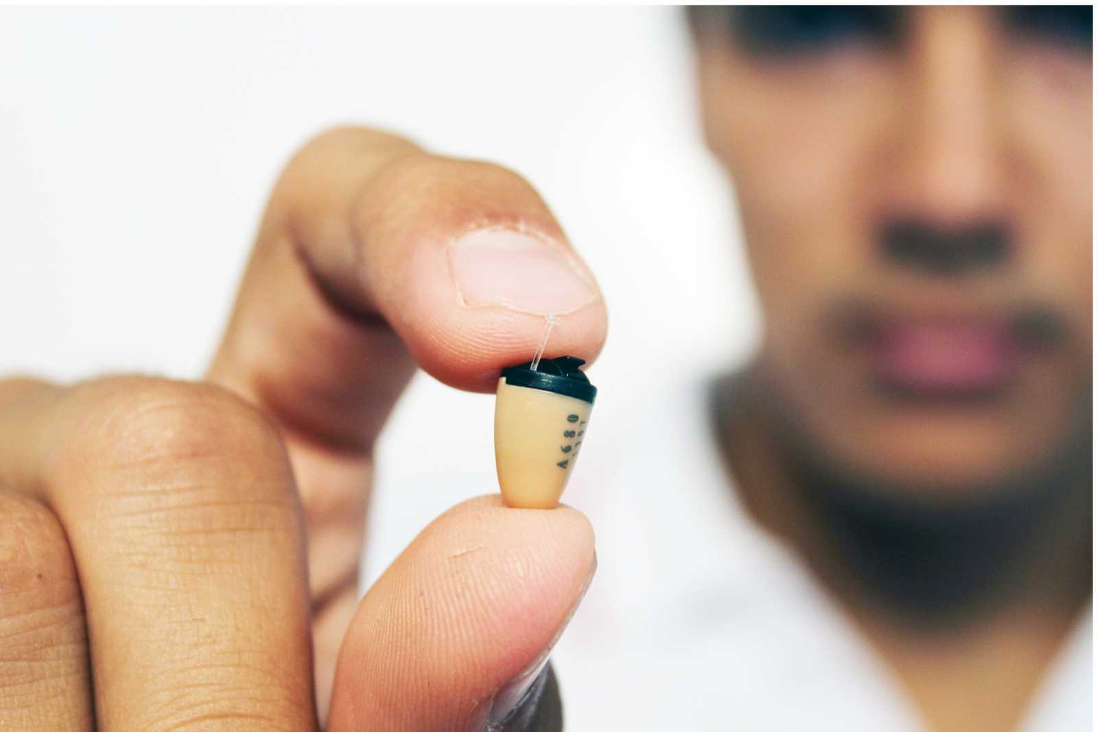 - Капсулу вставляют в ухо пальцами, пытаясь вкрутить ее поглубже, чтобы она не была заметна для посторонних глаз.