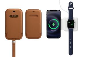 В беспроводной MagSafe Duo iPhone 12 можно заряжать, не снимая новый кожаный чехол. С адаптером на 20 Вт скорость работы увеличивается.