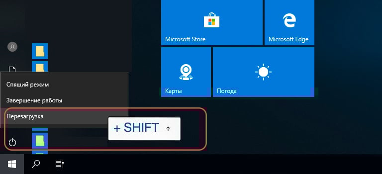 - нажимаем на клавишу Shift и активируем перезапуск системы;