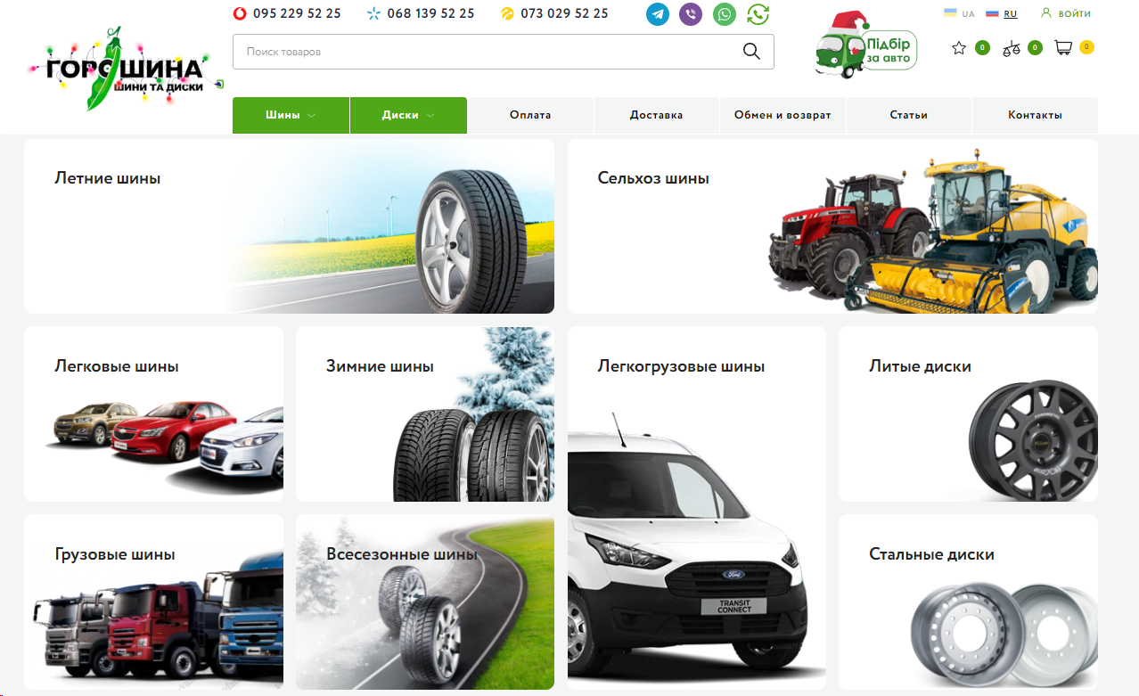 На сайте Goroshina.ua шины купить онлайн можно под легковые, грузовые, легкогрузовые типы автомобилей и сельхозтехнику. Под каждую категорию ТС создан отдельный раздел, чтобы покупатель быстрее находил нужный товар.
