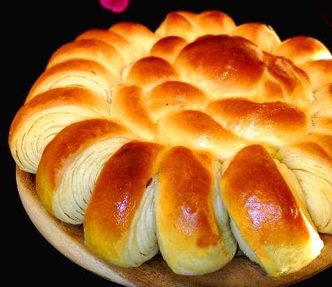 Каждая из трех оставшихся частей раскатывается в лист толщиной 2 мм, смазывается растопленным сливочным маслом и складывается друг на друга. Затем сворачиваем их рулетом, нарезаем на одинаковые круги и раскладываем на расстоянии друг от друга вокруг сформированного центра (см. фото). Смазываем взбитым яичным желтком (при желании, посыпаем кунжутом) и выпекаем около 30 минут в предварительно разогретой духовке до 180 градусов.