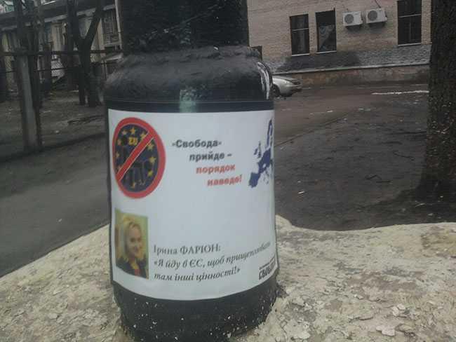 Авторы листовок, в частности, использовали портрет Ирины Фарион со слоганом: "Я иду в ЕС, чтобы прививать там другие ценности!".
